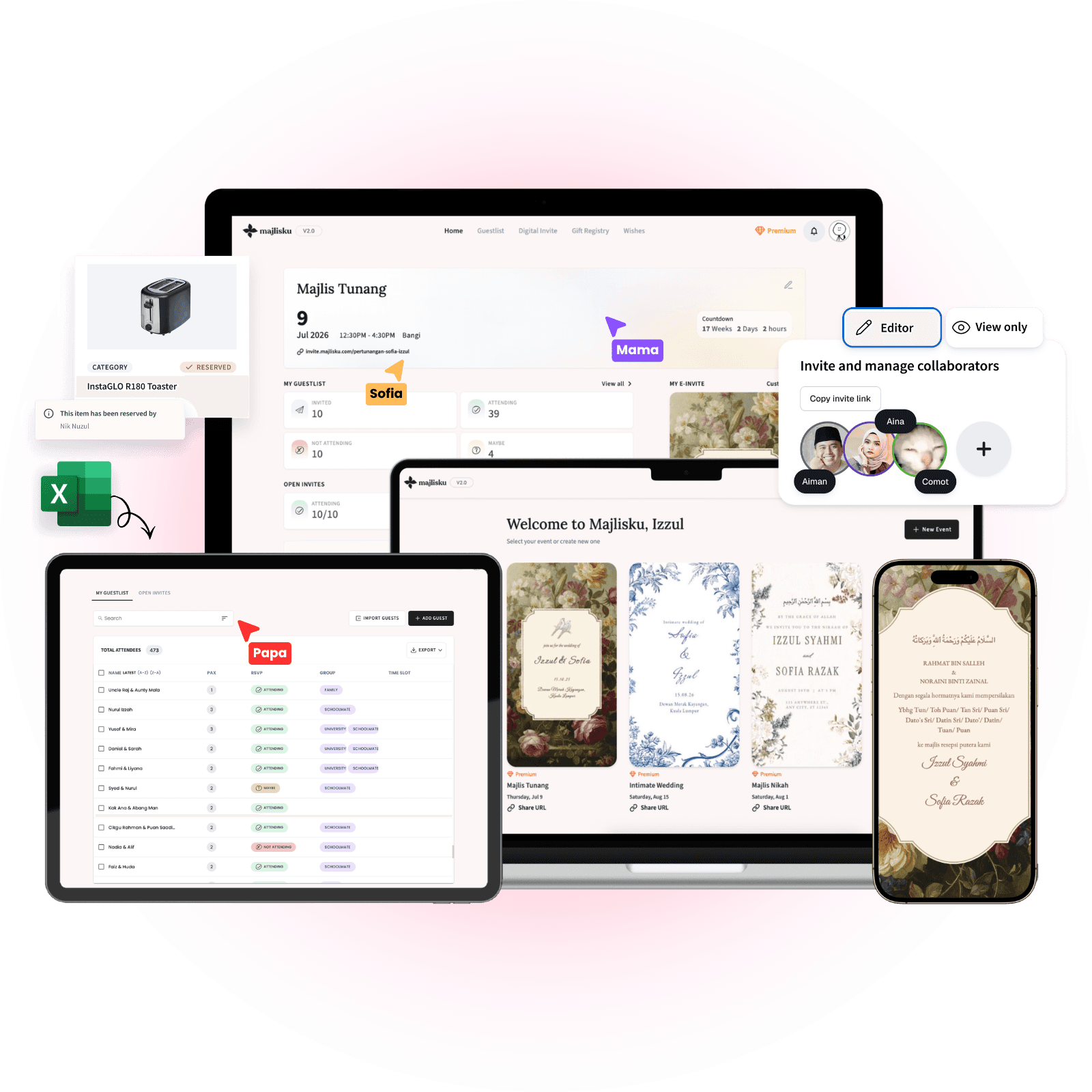 Dapat notifikasi RSVP, import list, group mengikut kategori dan export ke PDF . Semua dalam satu. Lebih kawalan.